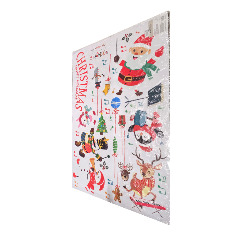 Fiecare desen este colorat în nuanțe vii de roșu, verde, auriu și alb, iar textul decorativ „Merry Christmas – Happy Holidays” completează perfect atmosfera festivă. Autocolantele pot fi aplicate pe ferestre, uși, oglinzi sau pereți și sunt ușor de îndepărtat fără a lăsa