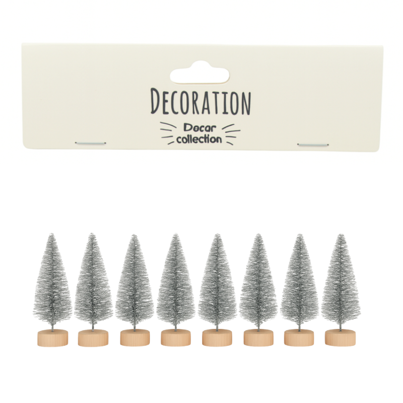 Completează decorul tău de Crăciun cu acest set elegant de brazi ornamentali argintii. Fiecare brăduț este acoperit cu sclipici strălucitor, oferind un efect festiv rafinat. Setul conține 8 piese perfecte pentru decoruri de iarnă sau aranjamente de masă.