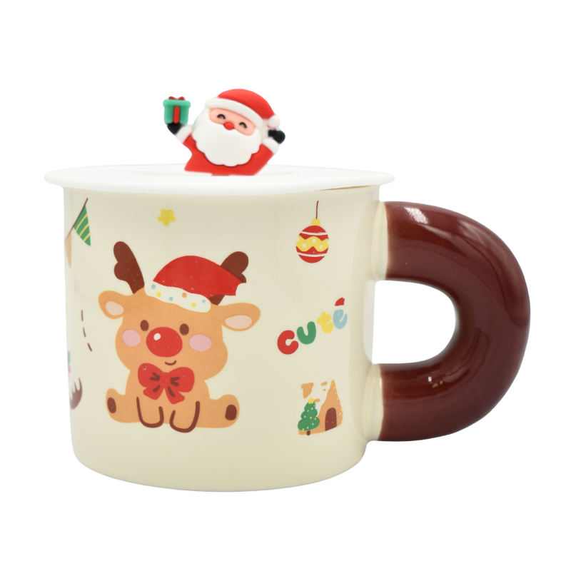 Această cană de Crăciun din ceramică îți aduce instant spiritul sărbătorilor datorită designului adorabil cu Moș Crăciun și reni. Capacelul cu figurina moșulețului este atât decorativ, cât și practic, menținând băutura caldă mai mult timp. Este perfectă pentru ceai, ciocolată caldă sau cadouri de sezon.