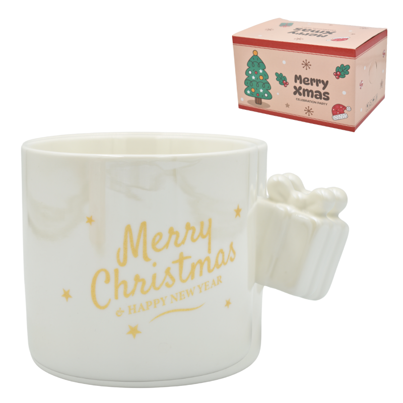 Cana din ceramică de 340 ml îți aduce magia sărbătorilor direct în fiecare înghițitură. Are un design elegant, cu mesaj festiv și un mâner în formă de cadou care îi oferă un farmec aparte. Este perfectă pentru a savura băuturile preferate în sezonul rece sau pentru a fi dăruită cuiva drag.