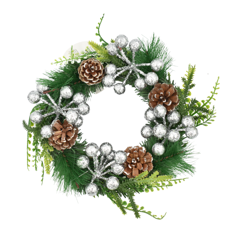 Această coroniță de Crăciun verde îți aduce instant atmosfera sărbătorilor în casă. Conurile de brad naturale și decorațiunile argintii îi oferă un aspect elegant și festiv. O poți agăța pe ușă, la fereastră sau o poți folosi ca decor de masă.