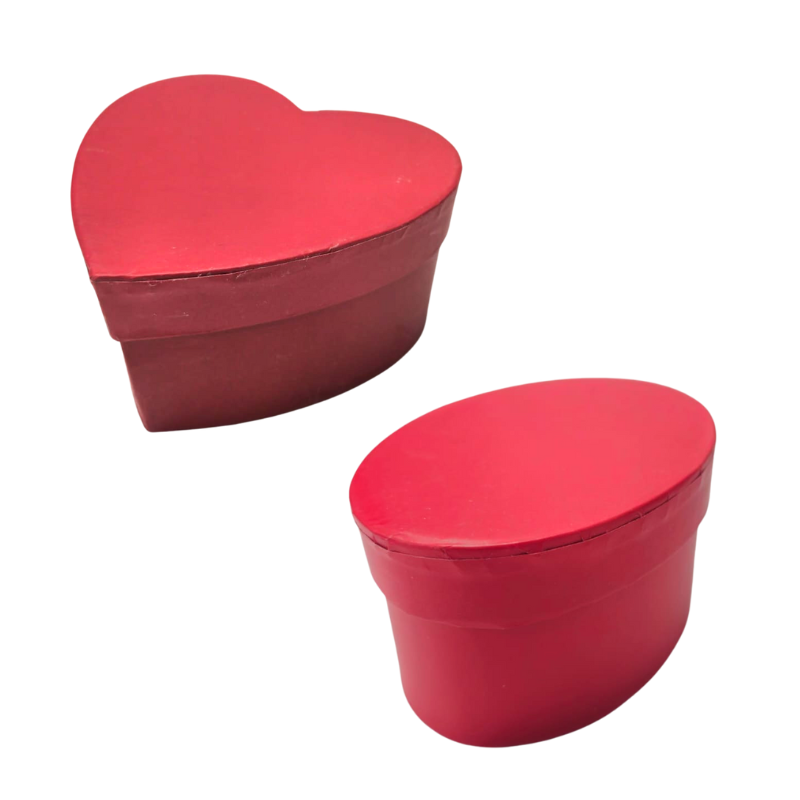 Cutie cadou roșie, realizată din carton, cu dimensiunea de 12 cm. Este disponibilă în două forme diferite, inimă și ovală, fiind potrivită pentru ambalarea cadourilor mici.