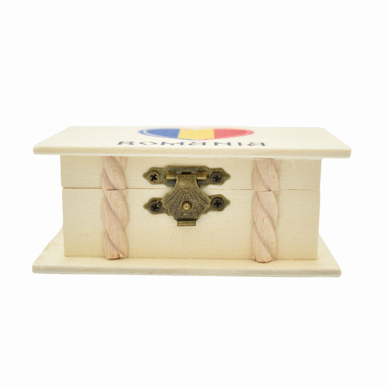 Vei descoperi că această cutie din lemn, cu dimensiunile sale reduse de 6 x 10,5 cm, este perfectă pentru a păstra obiecte delicate precum bijuterii fine, chei sau monede de valoare. Capacul este personalizat cu elemente vizuale reprezentative, îmbinând textul „România” cu simbolul tricolorului, oferind produsului un caracter unic și o identitate vizuală puternică.