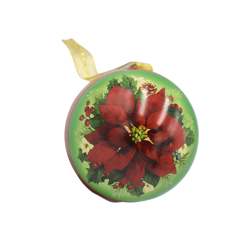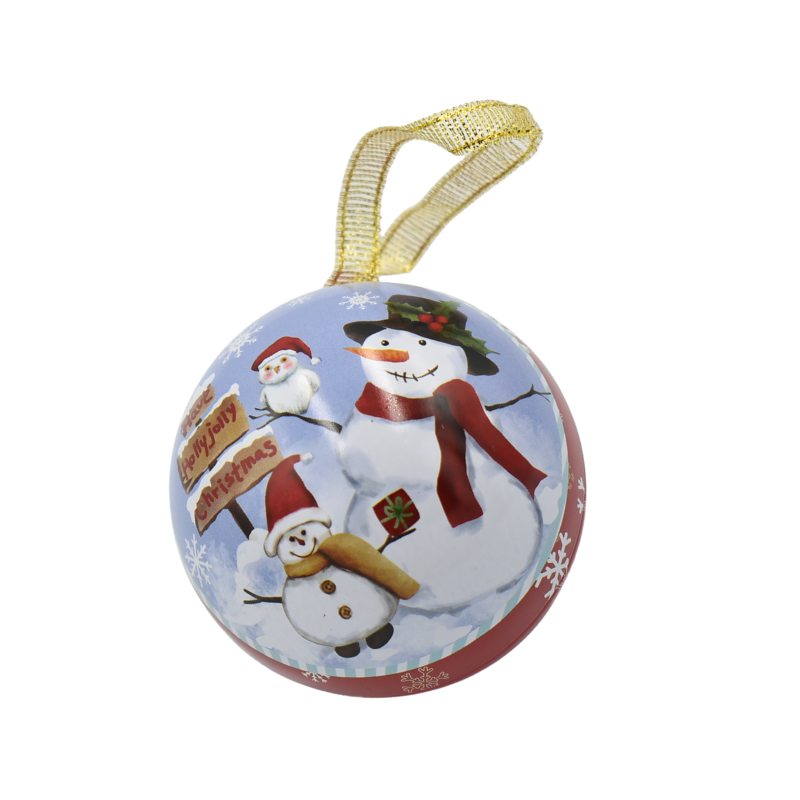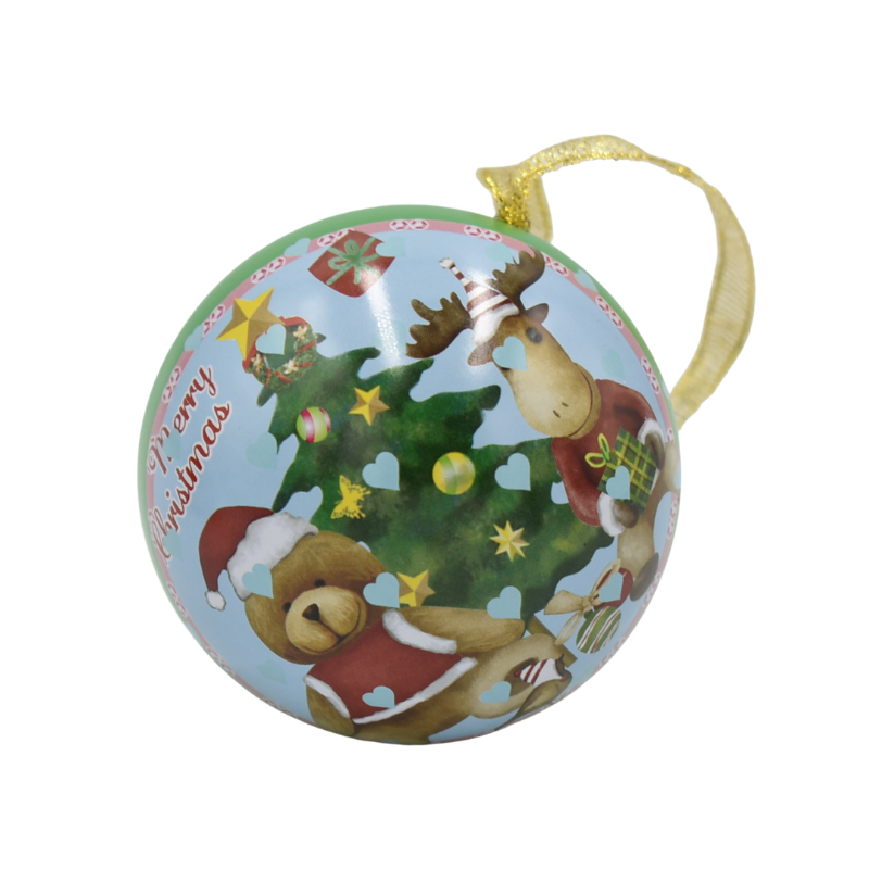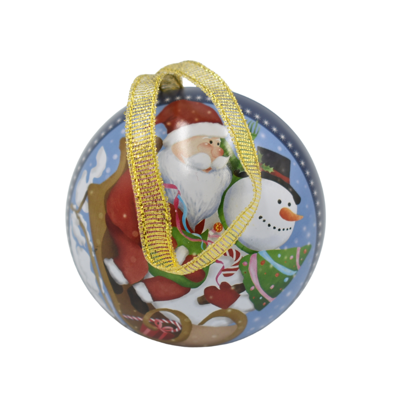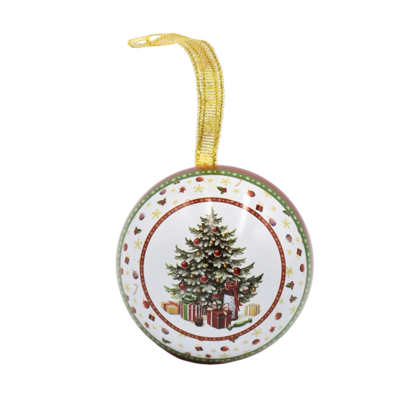 Cutie metalică în formă de glob, cu imprimeuri festive colorate, ideală pentru ambalarea cadourilor mici sau a dulciurilor de Crăciun. Poate fi folosită și ca ornament de brad. Disponibilă în mai multe modele.