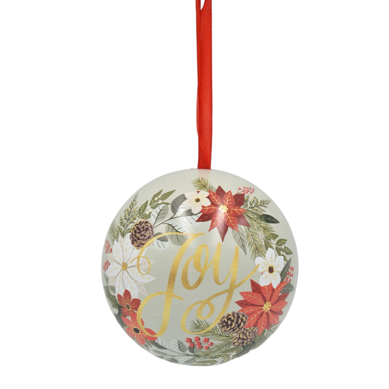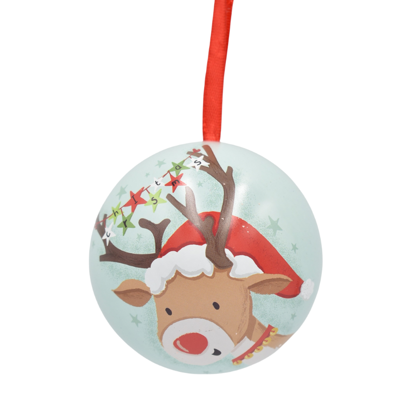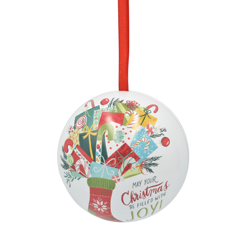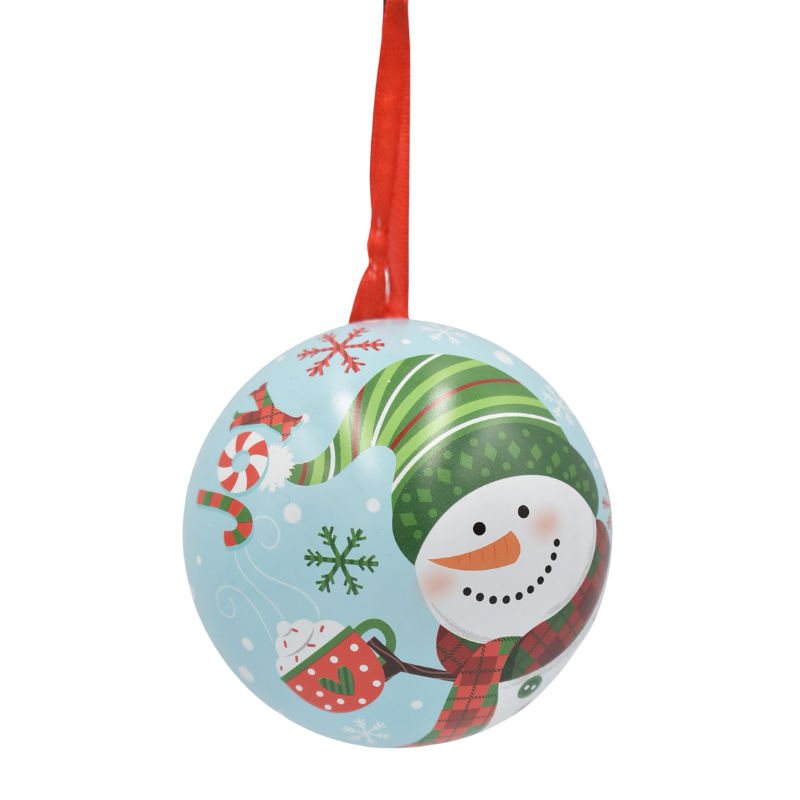 Această cutie metalică tip glob aduce un plus de farmec cadourilor tale de sărbători. Cu imprimeuri vesele și colorate, inspirate din atmosfera Crăciunului – oameni de zăpadă, reni, cadouri și flori de Crăciun – devine o alegere perfectă pentru ambalarea elegantă a bomboanelor, bijuteriilor sau altor mici surprize.