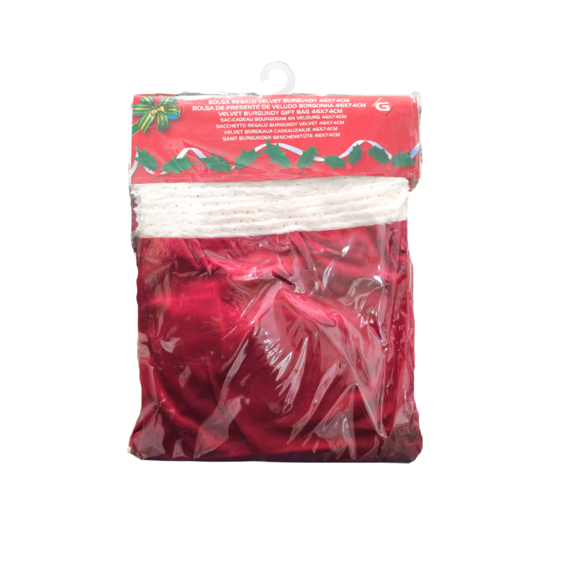Acest sac al Mosului este realizat dintr-un material catifelat de culoare burgundy si vine insotit de snur alb pentru inchidere. Este ideal pentru ambalarea cadourilor si pentru completarea decorului de Craciun datorita aspectului sau clasic si festiv. Dimensiunea sacului este 46cm x 74cm si permite depozitarea mai multor obiecte, fiind potrivit atat pentru decor, cat si pentru surprizele pregatite copiilor.