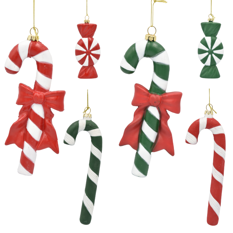 Sunt disponibile în trei variante diferite: bomboană rotundă, baston de Crăciun simplu și baston cu fundiță, fiecare în combinații de roșu cu alb sau verde cu alb.