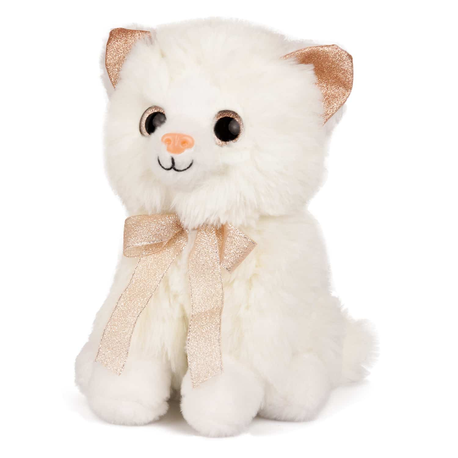 Această pisicuță de pluș, cu o înălțime de 20 cm, este confecționată dintr-un material catifelat și pufos, plăcut la atingere și sigur pentru copii. Detaliile sale strălucitoare — urechiușele aurii, ochii expresivi și fundița elegantă — îi oferă un aspect încântător și prietenos.