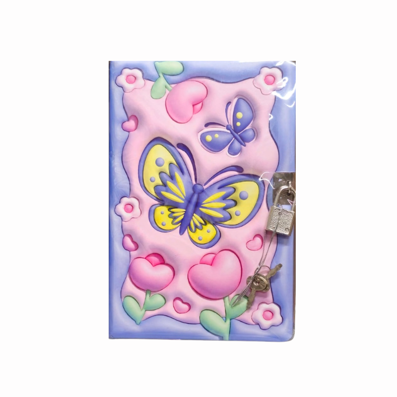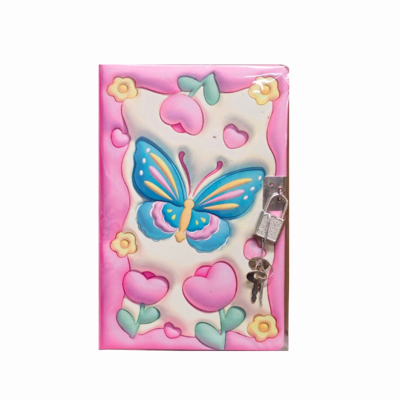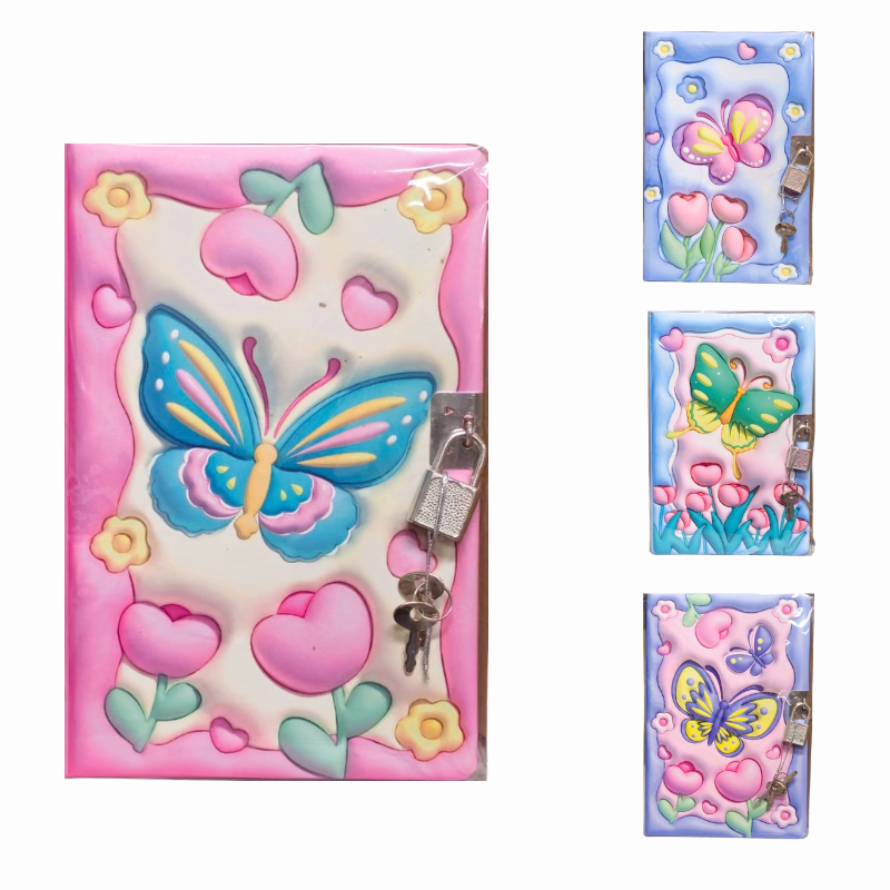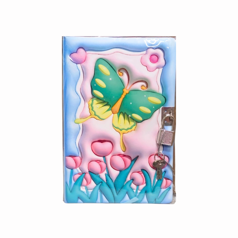 Jurnal format B6 cu 80 de file, decorat cu model vesel cu fluturași și elemente florale colorate. Este prevăzut cu lacăt și cheiță, oferind un plus de intimitate pentru notițe, gânduri și amintiri personale. Potrivit pentru utilizarea zilnică, la școală sau acasă, fiind atât practice, cât și decorative.