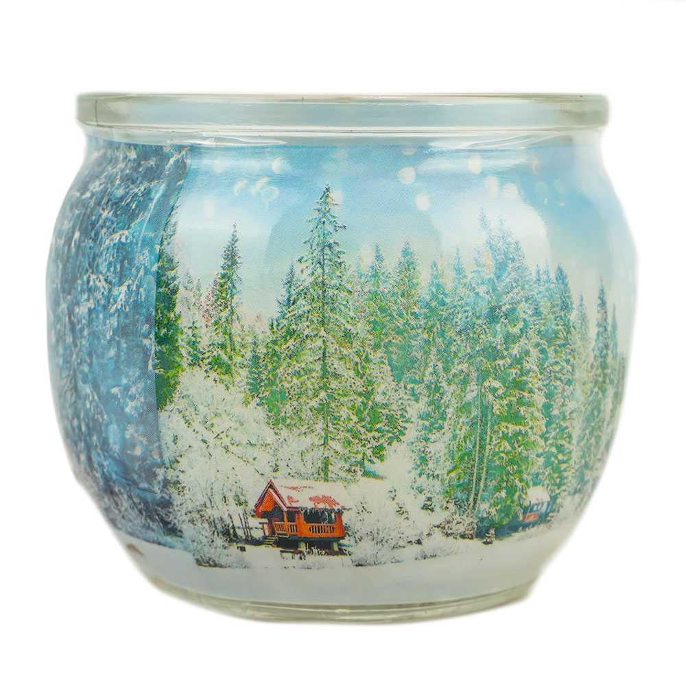 Paharul din sticlă este decorat cu un peisaj de poveste, în nuanțe reci de albastru și alb, cu brazi înalți, căsuțe primitoare și reflexii delicate care se luminează frumos atunci când lumânarea arde.