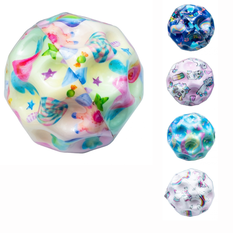 Tematica unicornului este redata prin ilustratii detaliate si culori pastelate, disponibile in modele variate: de la fundaluri roz si albastru deschis, pana la variante multicolore cu curcubee si stelute. Aceasta diversitate vizuala capteaza imediat atentia si stimuleaza imaginatia, facand din minge un obiect preferat pentru colectionat sau pentru a fi oferit cadou la petreceri. Dimensiunea de 6.3 cm este perfect adaptata pentru portabilitate, putand fi transportata usor intr-un rucsac pentru joaca in parc sau in curtea scolii.