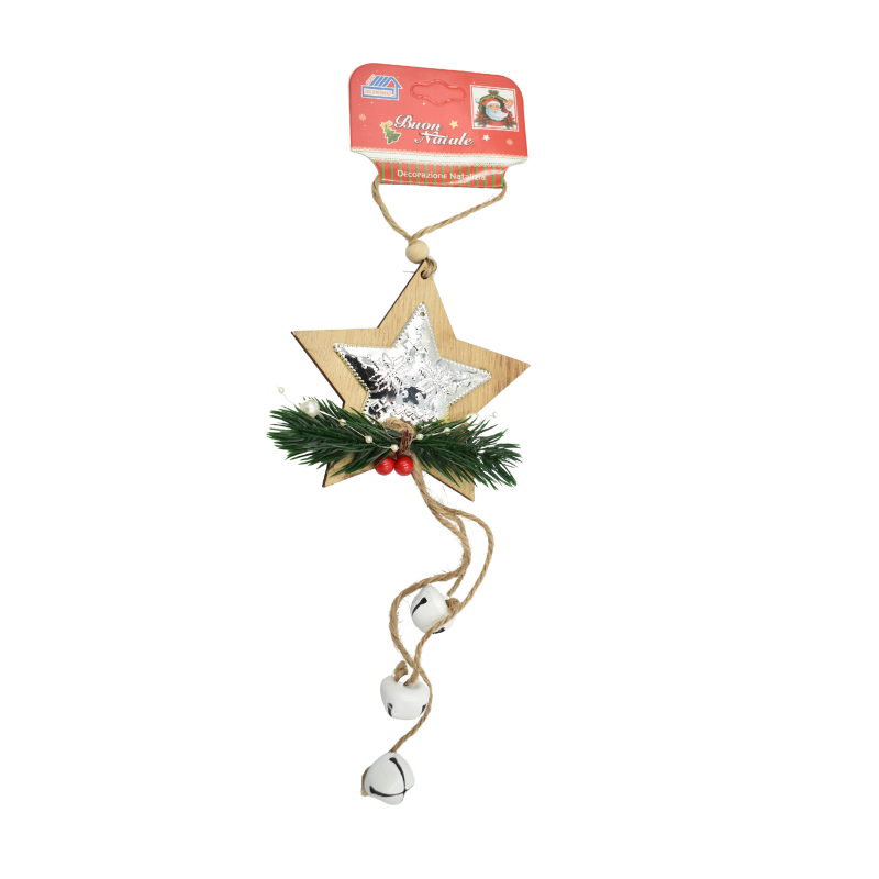 Ornamentul de agățat este realizat din lemn și este disponibil în forme variate, precum stea, brad sau inimă, fiecare model având aplicații metalice colorate și mici decorațiuni inspirate din sezonul rece. Elemente precum conuri verzi, bobițe roșii, șnur din iută și clopoței completează aspectul rustic și aduc un plus de atmosferă festivă. Fiecare ornament este conceput pentru a fi ușor de agățat pe brad, la geam sau în orice alt spațiu decorativ, fiind ideal pentru a crea o ambianță călduroasă și plină de farmec în perioada sărbătorilor.