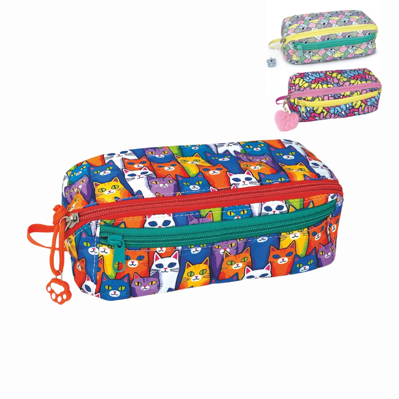 Penarul tip borșetă cu două compartimente este conceput pentru a oferi maximum de funcționalitate și un aspect estetic deosebit, fiind disponibil în trei modele asortate cu imprimeuri vibrante. Structura sa robustă include două secțiuni principale securizate cu fermoare rezistente, oferind spațiu generos pentru carioci, creioane, pixuri și alte accesorii de papetărie esențiale. Interiorul este inteligent compartimentat cu un divizor central, facilitând separarea obiectelor mici de cele voluminoase pentru un acces rapid și facil în timpul orelor de curs.