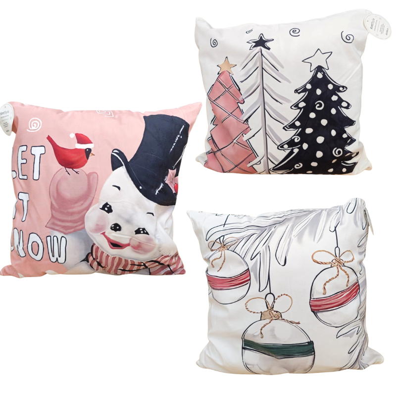Perna decorativă Crăciun roz 45x45cm este perfectă pentru a completa decorul de iarnă prin imprimeurile sale delicate și tematice. Modelele includ un om de zăpadă vesel cu pălărie, brăduți stilizate în nuanțe de roz și negru, precum și globuri agățate pe ramuri, toate ilustrate în culori blânde și detalii fine. Aspectul prietenos și designul festiv aduc un plus de căldură în living, dormitor sau hol. Materialul are un aspect plăcut, iar culorile pastelate creează o atmosferă liniștită și primitoare. Dimensiunea de 45x45cm este ideală pentru a adăuga un accent decorativ sezonier fără a ocupa mult spațiu.