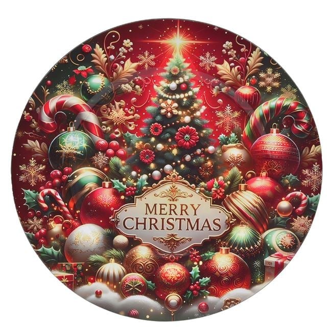Platoul este realizat din plastic rezistent și are un diametru de 33 cm, fiind potrivit pentru prăjituri, aperitive sau decor tematic de Crăciun. Modelul prezintă un brad împodobit, globuri și elemente festive care creează un aspect plin de culoare și energie. Suprafața sa este ușor de curățat, ceea ce îl face ideal pentru utilizarea repetată pe sărbătorilor.