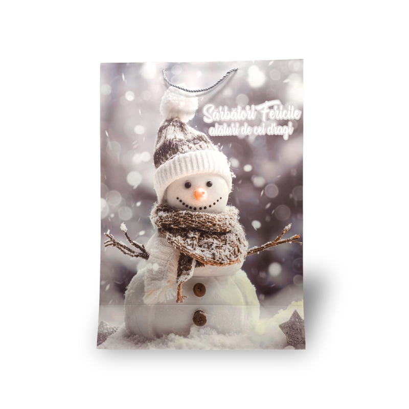Designul adorabil cu om de zăpadă, fulgi și peisaj de iarnă creează o imagine caldă și veselă, perfectă pentru a transmite emoția Crăciunului. Mesajul „Sărbători fericite alături de cei dragi” completează perfect imaginea, transformând ambalajul într-o parte importantă a darului.