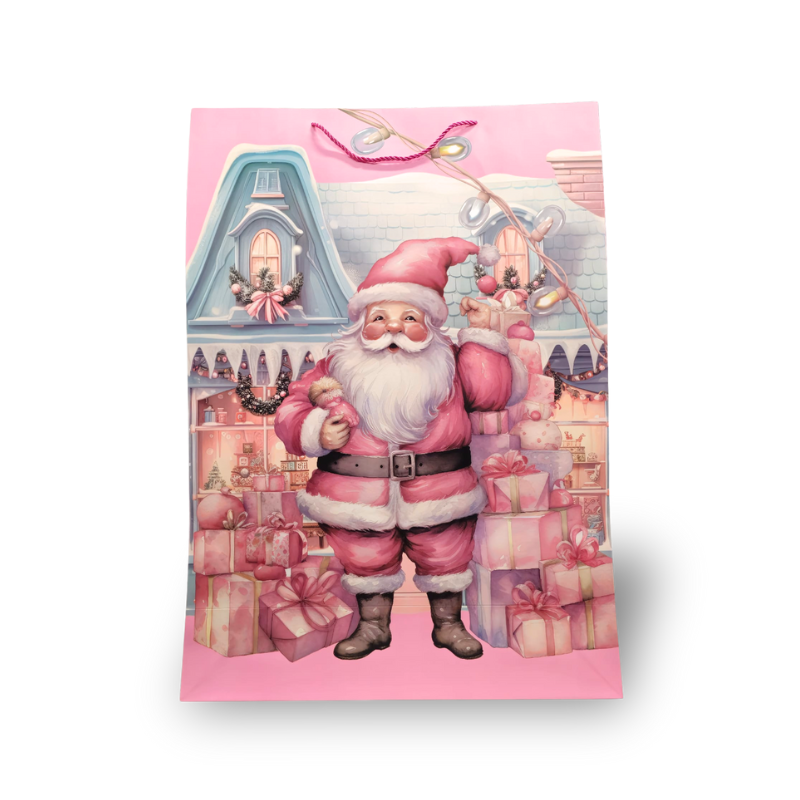 Această pungă cadou de Crăciun este perfectă pentru ambalarea elegantă a darurilor mari. Cu un design vesel ce îl înfățișează pe Moș Crăciun înconjurat de cadouri, punga adaugă un strop de magie principal dar oferit.