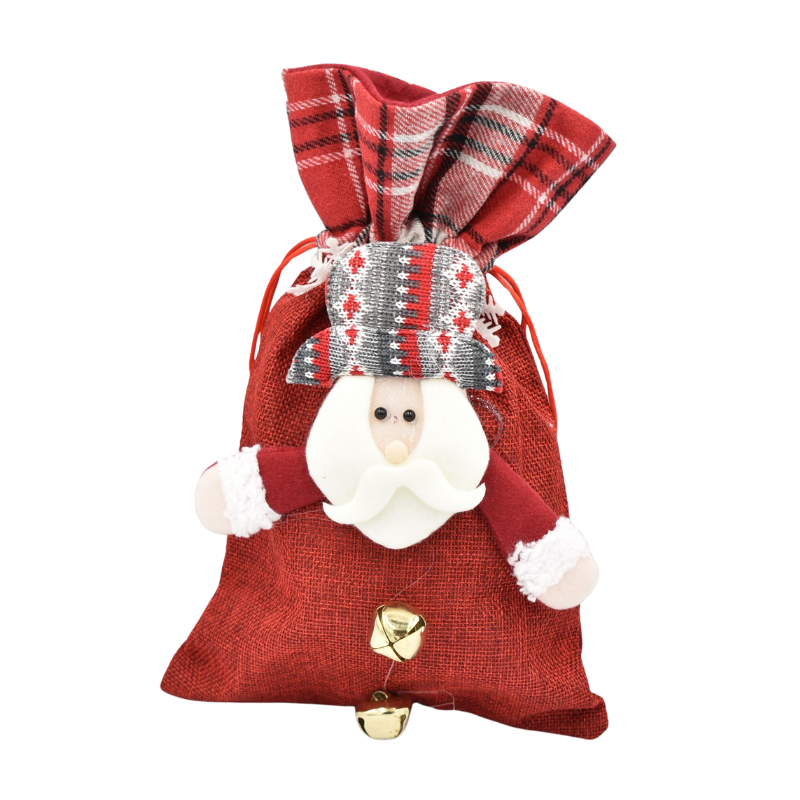 Transformă colțul tău festiv într-un spațiu plin de magie cu acest săculeț textil cu Moș Crăciun, creat într-un stil tradițional de iarnă.