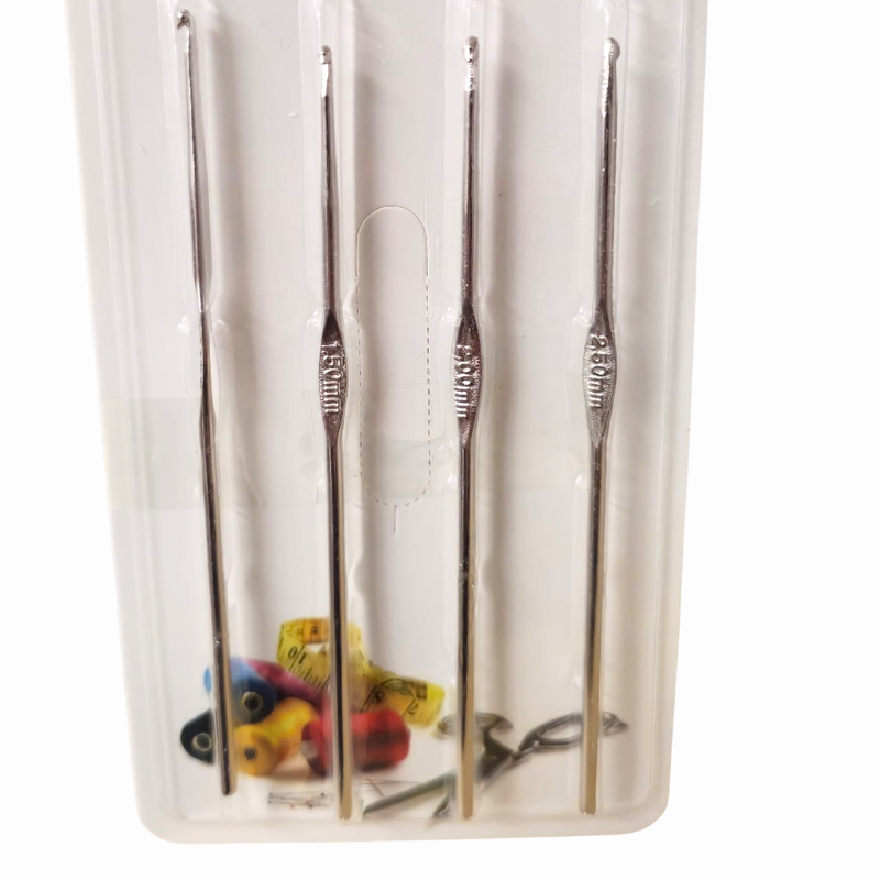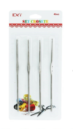Setul de croșete conține patru piese având realizate din metal, fiecare o lungime de 12 cm, concepute pentru manevrare ușoară și control bun în timpul lucrului. Include mărimile 1 mm, 1,5 mm, 2 mm și 2,5 mm, fiind potrivite pentru realizarea detaliilor fine, a dantelei, accesoriilor sau a proiectelor care necesită fire subțiri.