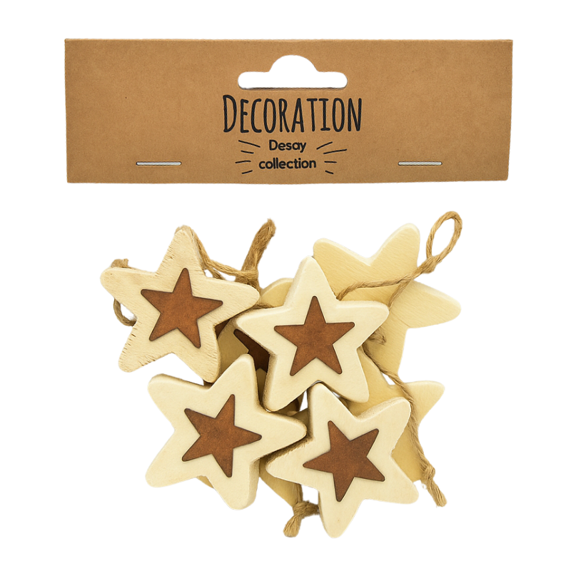 Acest set de stele din lemn aduce un farmec natural și cald decorului tău de Crăciun. Fiecare stea are un design rustic, cu o stea mică inserată central și o agatatoare practică pentru fixare rapidă. Perfecte pentru brad, ghirlande, cadouri sau decorarea meselor festive.