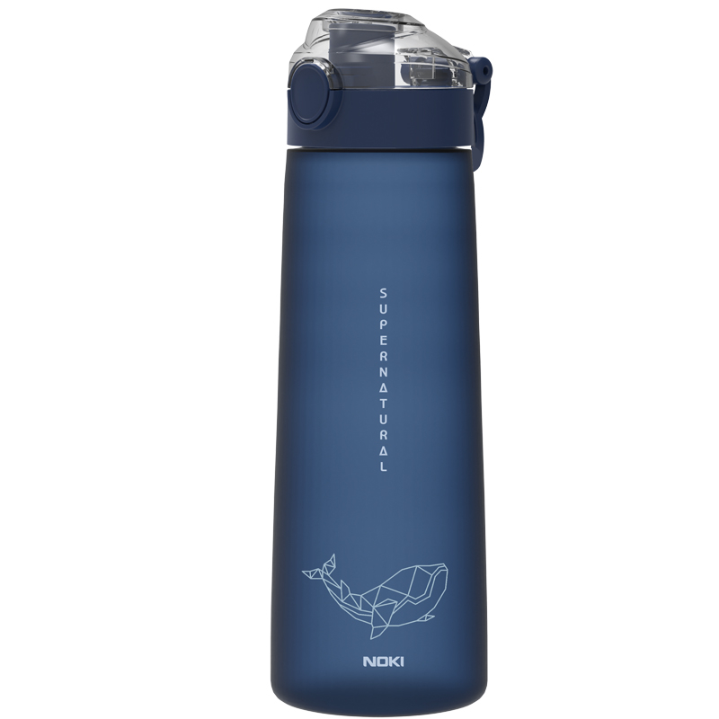 Sticlă de apă Noki din tritan, cu capacitate de 730 ml, deschidere automată și design modern, în culoarea albastru închis, potrivită pentru utilizare zilnică.