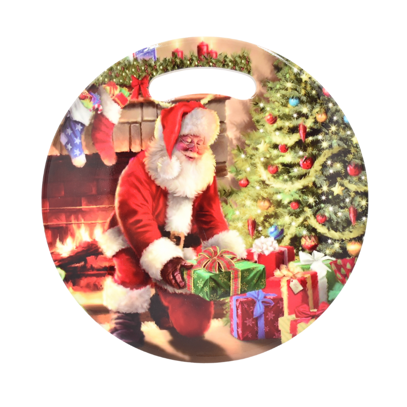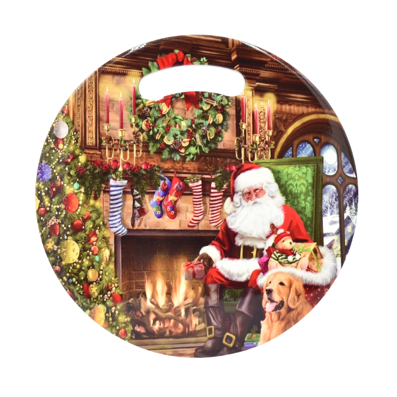 Are un diametru de 20 cm și un design festiv cu Moș Crăciun lângă bradul împodobit și șemineul aprins, perfect pentru a completa atmosfera caldă și veselă a Crăciunului.