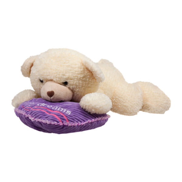 Ursulețul cu pernă de 35 cm este o jucărie de pluș delicată și fermecătoare, perfectă pentru a aduce zâmbete și visuri dulci celor mici. Confecționat dintr-un material moale, cu textură pufoasă, ursulețul are o expresie blândă și o pernă mov brodată cu mesajul “sweet dreams”, care îi completează perfect aspectul adorabil.