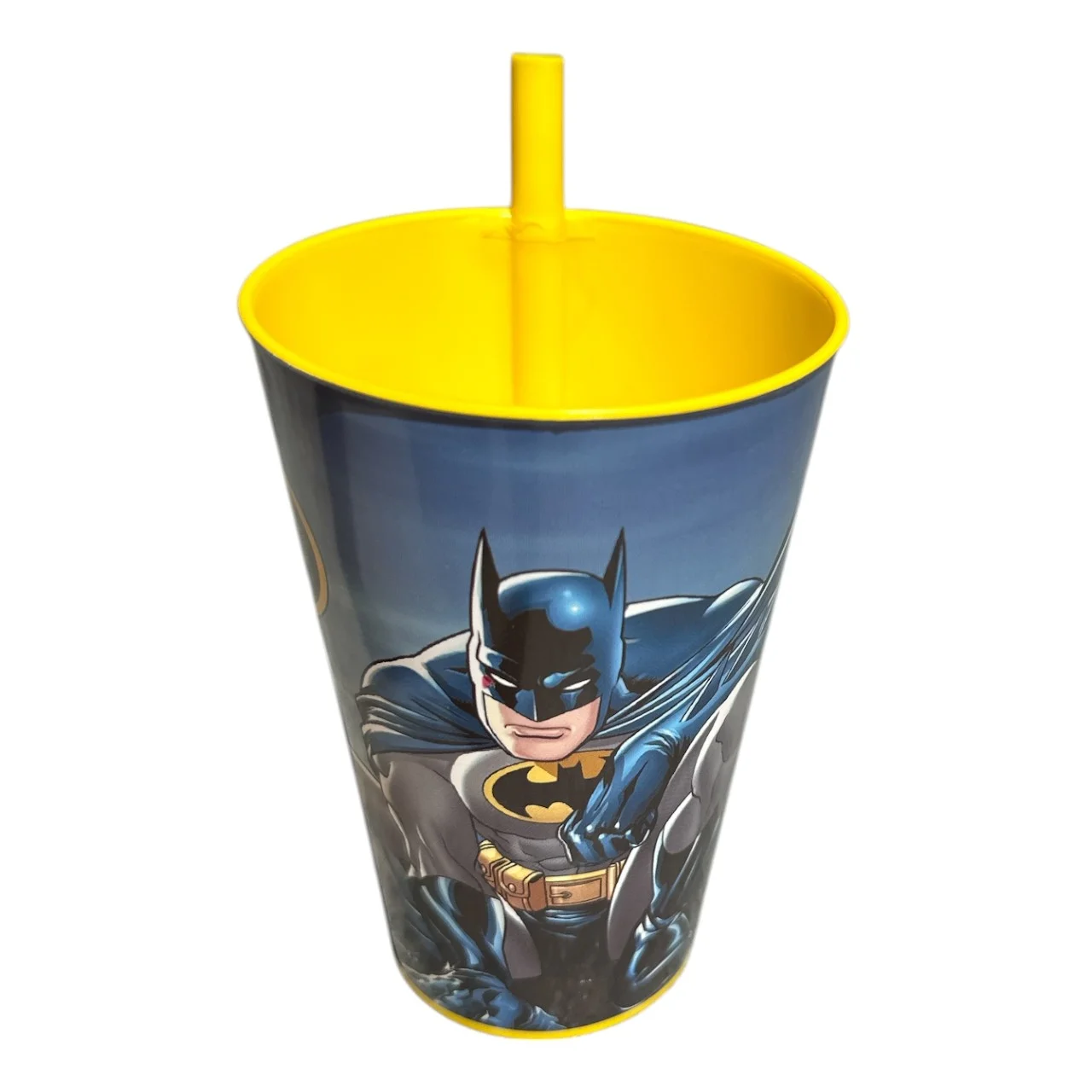 Punctul forte al acestui produs este paiul incorporat, care permite savurarea bauturilor fara efort si fara nevoia de a folosi accesorii separate, reducand riscul de varsare accidentala. Exteriorul paharului prezinta o ilustratie vibranta cu Batman in plina actiune, pe un fundal albastru nocturn, in timp ce interiorul si paiul au o culoare galbena intensa, specifica universului DC. Aceasta combinatie cromatica nu doar ca atrage atentia, dar aduce si un strop de entuziasm rutinei zilnice a copilului.