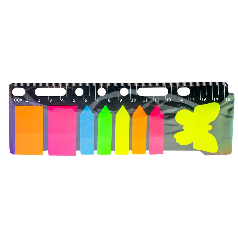 Set notes adeziv cu riglă, 8 grupuri de indecși în culori neon, câte 20 bucăți/grup. Include modele dreptunghi, săgeată și fluturaș pentru evidențiere rapidă. Indecși translucizi, autoadezivi și refolosibili, realizați din PET rezistent.