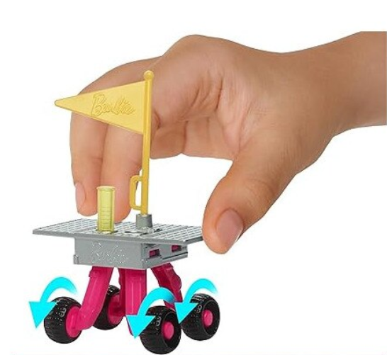 Papusa Barbie Astronaut - 65th Anniversary aduce un omagiu celor mai indragite profesii reprezentate de Barbie de-a lungul timpului. Imbracata intr-un costum spatial alb cu detalii roz si albastre, papusa este pregatita pentru explorari cosmice. Setul include 10 accesorii tematice precum casca cu viziera dubla, laptop, gustare spatiala, steag cu mesaj Barbie, dar si un vehicul de explorare mobil. Copiii pot crea scenarii pline de imaginatie, visand la calatorii in spatiu, in timp ce colectionarii vor aprecia designul autentic si detaliile atent realizate. Cu parul saten si manusi spatiale, Barbie este gata sa exploreze necunoscutul si sa inspire micii visatori.