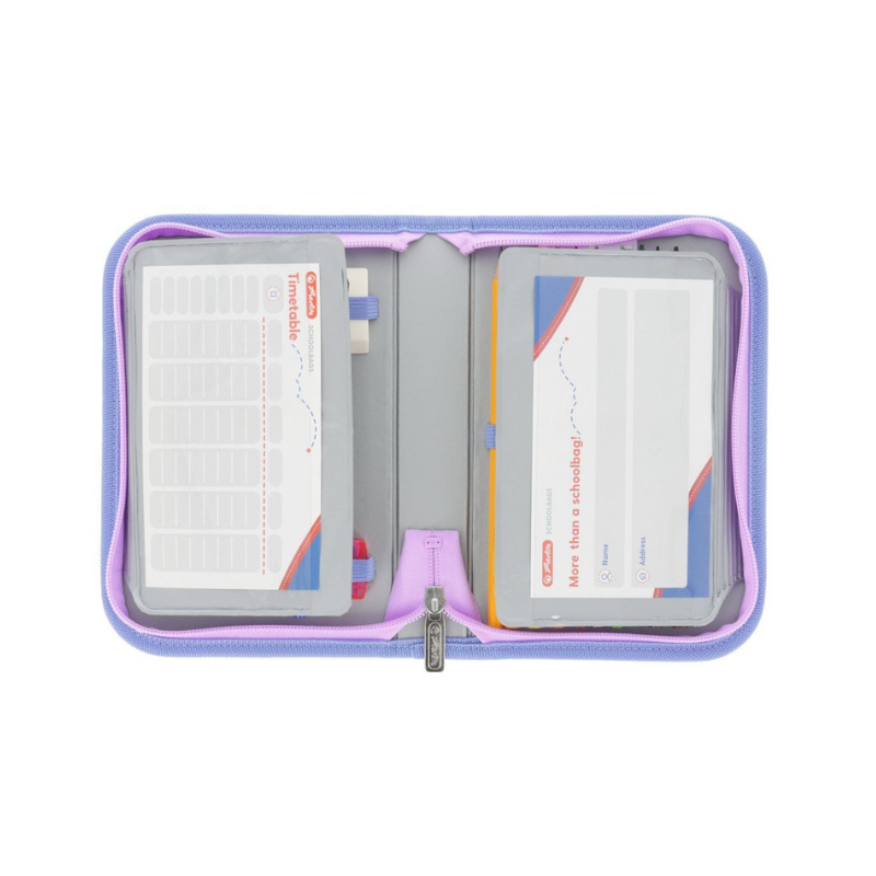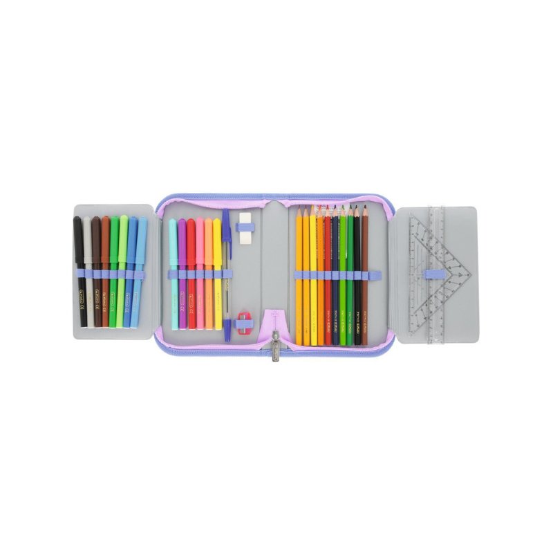 Penarul este dotat cu 2 clape interioare și un compartiment central, toate prevăzute cu benzi elastice ce păstrează fiecare piesă la locul ei. Include 31 de piese utile, precum: 12 creioane colorate, 12 carioci, 2 creioane grafit, 1 pix, riglă, echer, oreion, radieră și ascuțitoare – tot ce ai nevoie pentru scris, colorat și creativitate la școală. Materialul exterior este rezistent și ușor de curățat, iar fermoarul solid garantează durabilitatea zilnică.