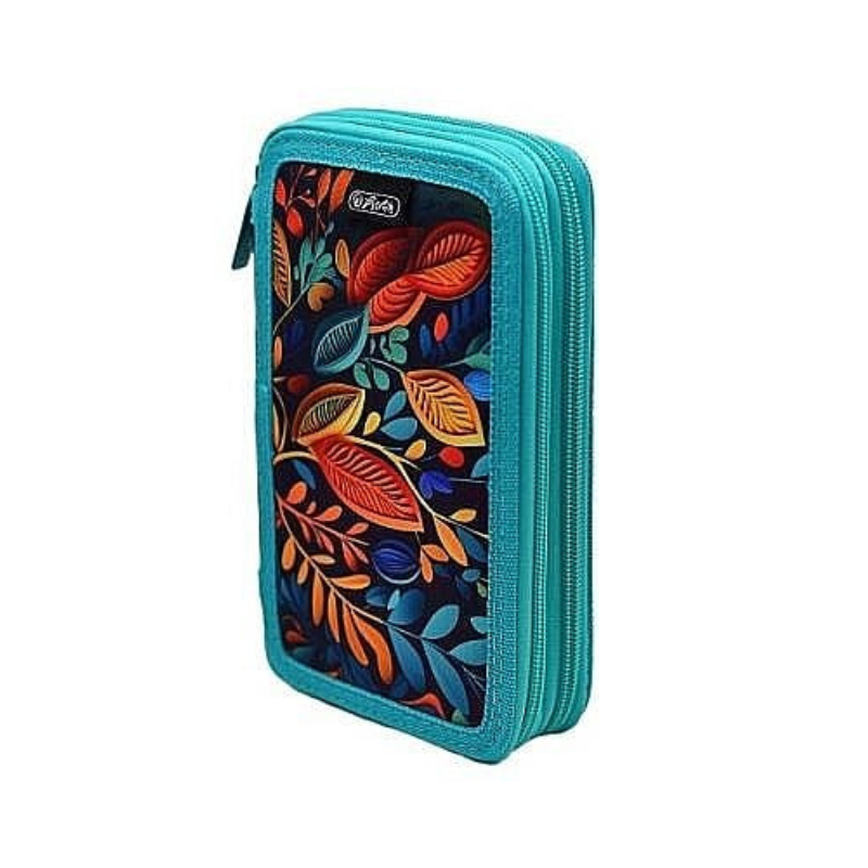 Organizează-ți eficient toate instrumentele de scris cu acest penar neechipat cu două fermoare, decorat cu un motiv floral abstract în culori vii. Este o alegere ideală pentru școală sau activități creative, datorită designului practic și aspectului deosebit.