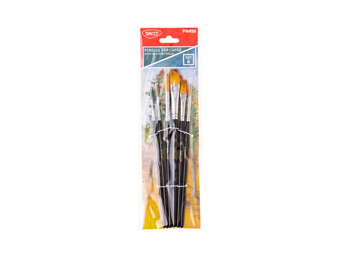 Setul de pensule Daco conține 6 pensule din păr de capră în dimensiuni variate. Ideal pentru pictură și activități artistice. Potrivite pentru școală și hobby-uri creative.