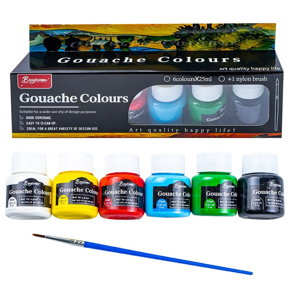 - Setul contine 1 pensula si 6 culori intense, galben, rosu, bleu, verde, insotite de alb si negru, culori potrivite pentru a dezvolta creativitatea micilor artisti.