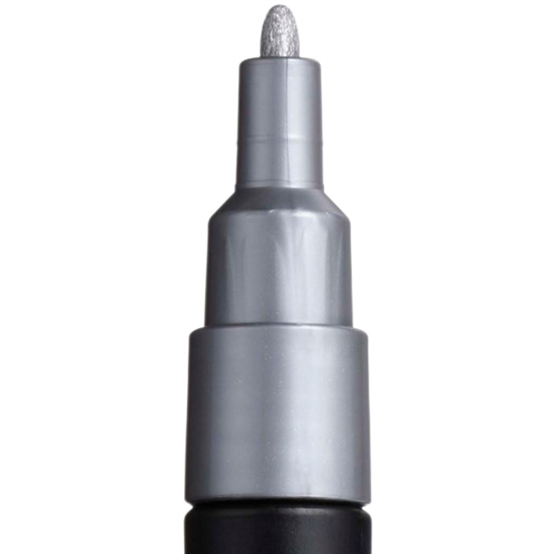 Markerul UNI Posca PC-3M argintiu adaugă o notă elegantă și strălucitoare creațiilor tale. Vârful rotund fin de 0.9-1.3 mm este perfect pentru detalii precise și accente. Vopseaua acrilică metalizată, pe bază de apă, este intensă, opacă și rezistentă.