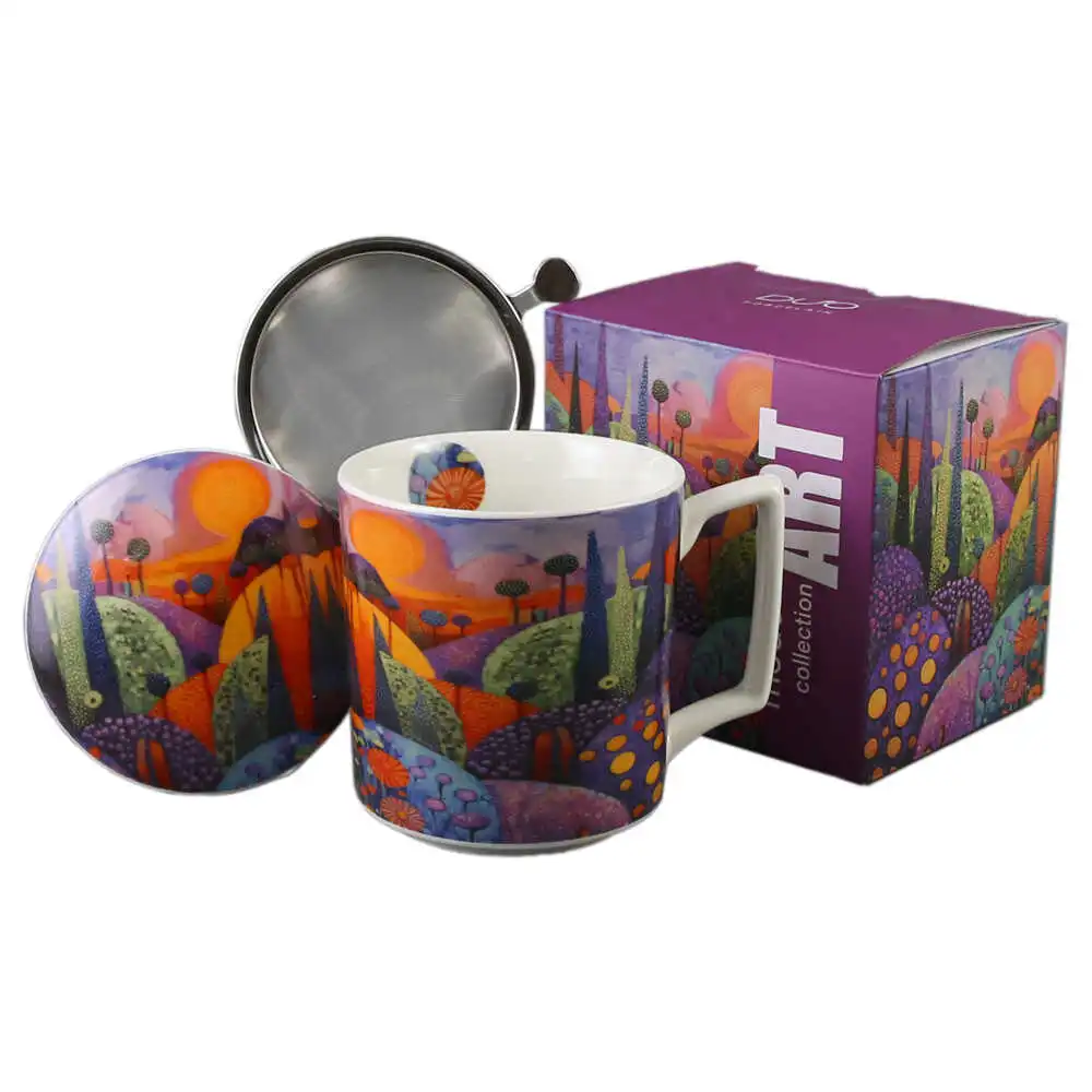 Această cană din porțelan de 450 ml este alegerea ideală pentru iubitorii de ceai care apreciază atât funcționalitatea, cât și designul deosebit. Modelul Modern Bubbly Hills impresionează prin culorile vibrante și peisajele artistice stilizate, transformând fiecare pauză într-un moment plin de culoare și inspirație.