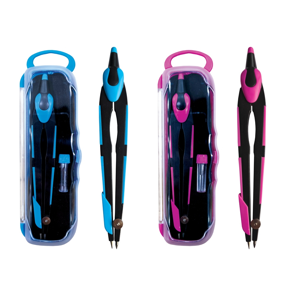 Compasul S-COOL este un instrument de nelipsit pentru școală, oferind precizie și ușurință în utilizare. Cu un design modern și ergonomic, compasul este format din două brațe metalice, unul prevăzut cu ac de fixare, iar celălalt cu mină de grafit înlocuibilă. Bratele sunt decorate cu insertii din plastic colorat, ceea ce îi oferă un aspect atractiv și practic.