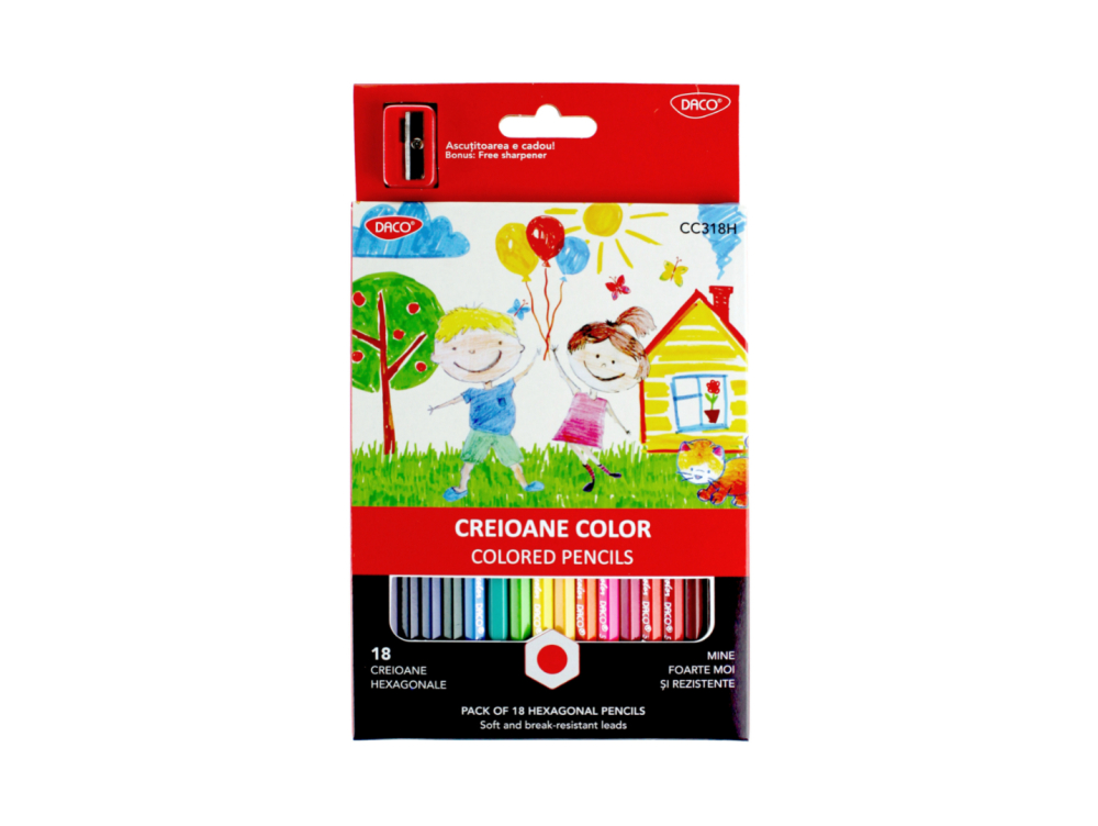Setul de 18 creioane color hexagonale Daco oferă o gamă variată de culori intense pentru desen și colorat. Mina este moale și rezistentă, pentru o aplicare uniformă. Ideal pentru școală, teme sau activități creative acasă.