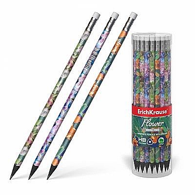 Creion graphite cu radiera, lemn negru, corp triunghiular, model Flori.