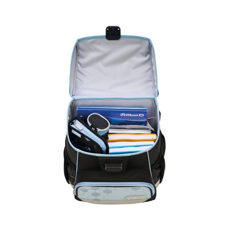 Interiorul este spațios, cu două subdiviziuni, inclusiv un compartiment separat pentru cărți. Buzunarele laterale elastice și cel frontal cu fermoar permit acces rapid la obiectele esențiale. Baza ghiozdanului este rigidă și prevăzută cu piciorușe din plastic pentru protecție împotriva umezelii.