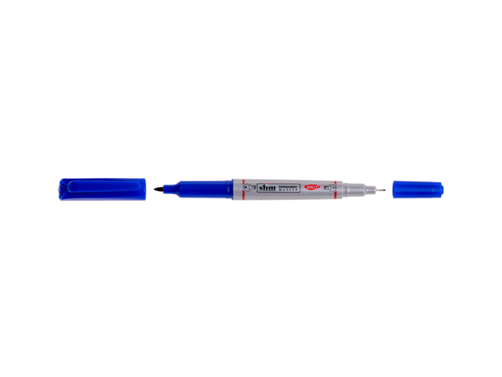 Markerul permanent slim DACO albastru este instrumentul ideal pentru scris, desen, etichetare sau notițe creative, oferind un echilibru perfect între precizie și durabilitate. Cerneala pe bază de alcool asigură o aplicare uniformă și o ușcare rapidă, prevenind petele și oferind un rezultat curat și profesionist. Culoarea albastru intens oferă contrast excelent și lizibilitate ridicată pe orice suprafață. Designul cu dublu vârf vă oferă flexibilitate totală, vârful de 0.5 mm fiind potrivit pentru linii fine, contururi și scris detaliat, iar vârful de 1 mm ideal pentru liniile mai groase, accentuate și vizibilitatea distanței. Cerneala este rezistentă la apă și la razele UV, menținând culoarea intensă în timp fără estompare sau ștergere. Markerul scrie eficient pe carton, plastic, metal, lemn sau sticlă, fiind potrivit pentru birou, școală, atelier sau proiecte creative acasă.