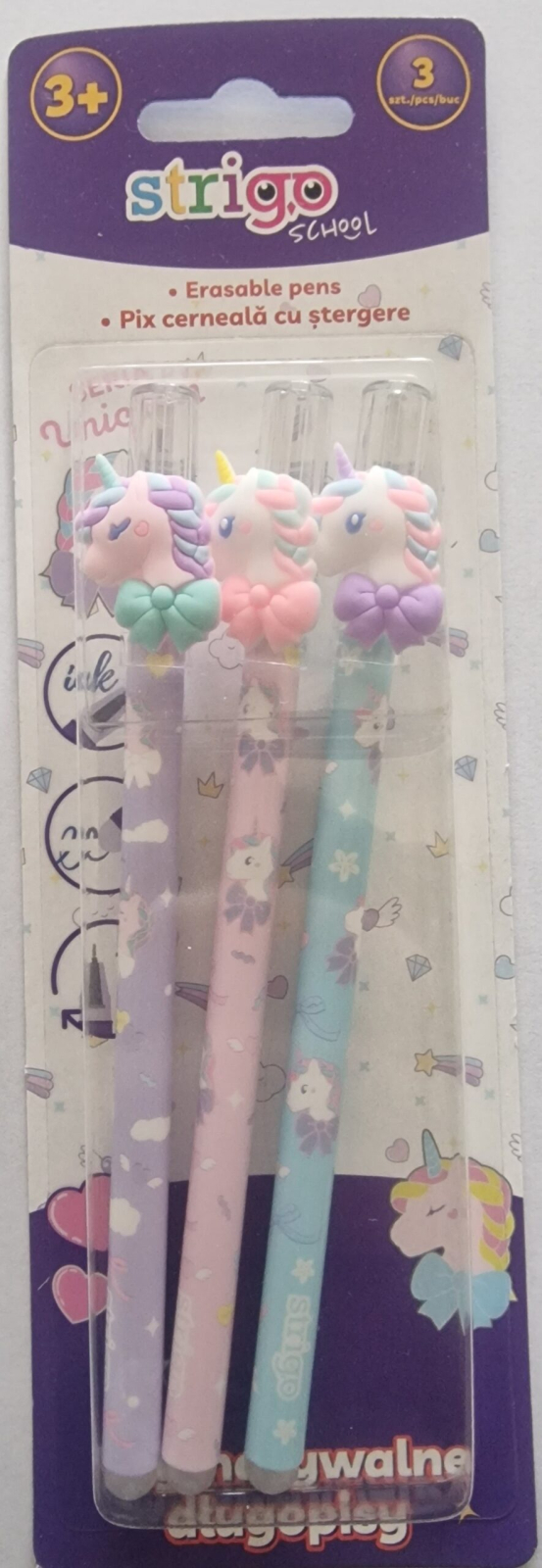 Acest blister Strigo lung conține 3 pixuri cu cerneală termosensibilă, poate să se ștearsă cu ajutorul radierei integrate, aflată în capătul vârfului de scriere. Pixurile sunt potrivite cu capac și au un design pastelat, decorate cu figurine Unicorn, atractive pentru copii. Corpul multicolor și grosimea de scriere potrivită asigură un scris cursiv și clar, fiind o alegere practică pentru exerciții, teme sau notițe. Setul este ușor de folosit și potrivit pentru activitățile școlare de zi cu zi.