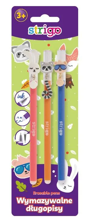 Blisterul Strigo conține pixuri cu cerneală termosensibilă, concepute pentru scriere corectabilă și utilizare zilnică. Cerneala specială permite ștergerea greșelilor prin frecare, oferind o experiență practică și fără urme pe pagină. Pixurile sunt decorate cu personaje din colecția Forest heroes, având un aspect jucăuș care le face îndrăgite de copii. Setul este potrivit pentru activități școlare, exerciții de scris sau desen, combinând funcționalitatea cu un design atractiv.