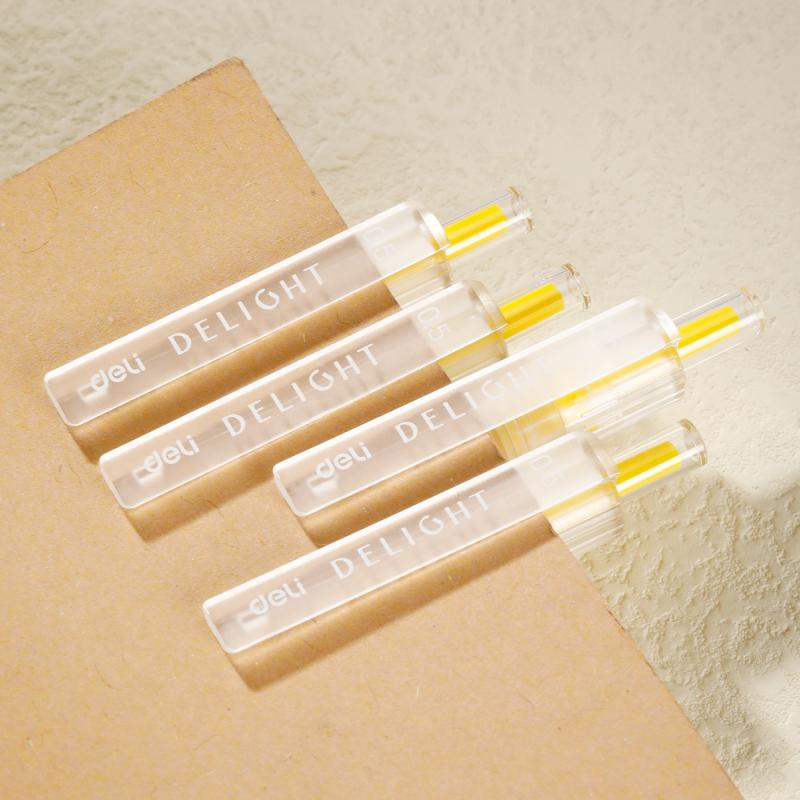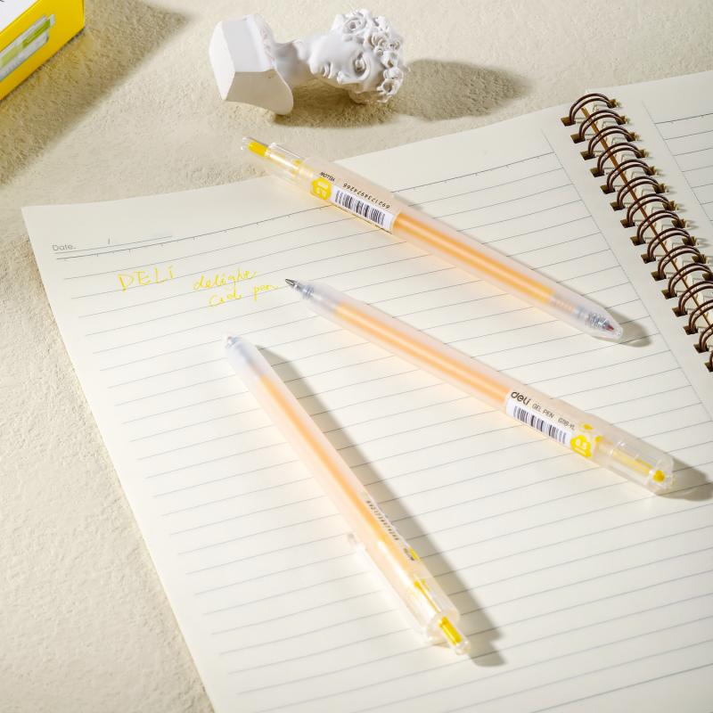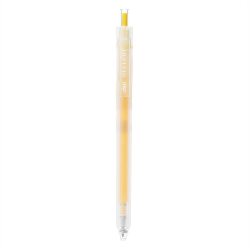 Pixul cu gel cu mecanism Delight Deli 0.5 mm galben este alegerea potrivită atunci când vrei să adaugi un plus de culoare paginilor tale. Vârful metalic de 0.5 mm permite o scriere subțire și uniformă, potrivită pentru teme, cursuri, agende sau planificatoare.