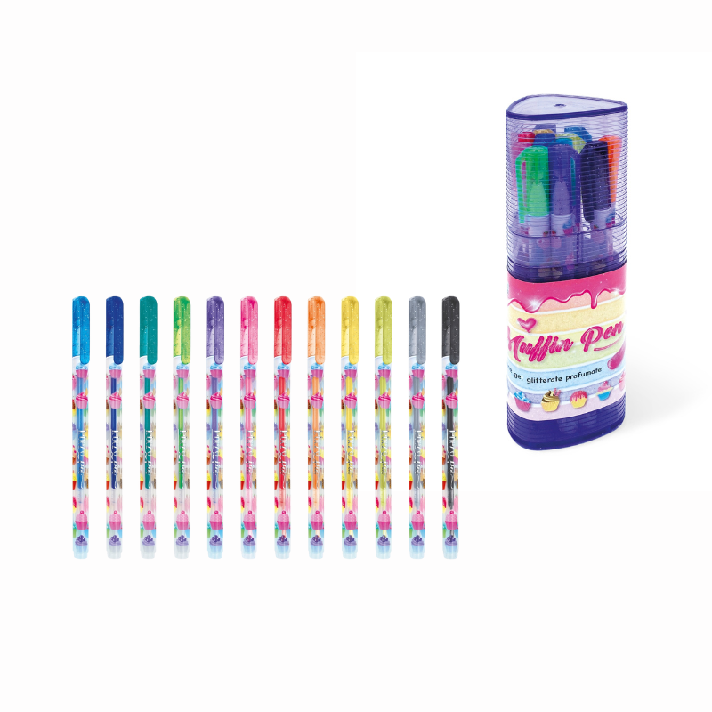 Setul de pixuri cu sclipici parfumat include 12 culori diferite, potrivite pentru activități creative, notificări sau decorare caietelor. Cerneala cu sclipici parfumat adaugă un plus de efect vizual și plăcere la scris. Pixurile sunt așezate într-o carcasă, care permite depozitarea și transportul ușor.