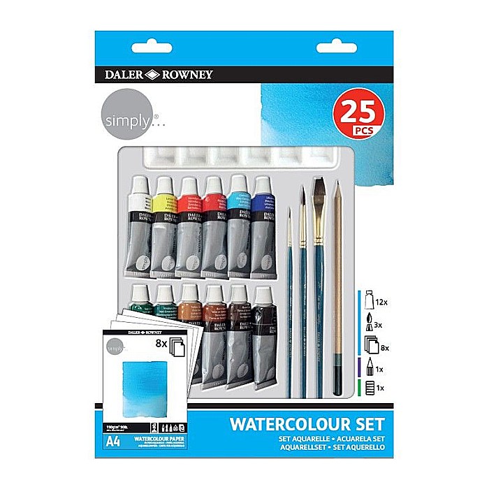 Set pictura culori acuarele, ideal pentru incepatori sau amatori. Cuprinde 25 de materiale esentiale, care te vor inspira sa iti transpui creativitatea in lucrari pe hartie. Alegere ideala pentru pasionatii de pictura, care doresc sa invete bazele picturii in acuarela sau sa exerseze pentru perfectioarea stilului.