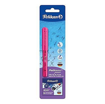 Stilou Pelikan, model Pelikano Junior, penita A din otel inoxidabil, corp din material plastic, zona de grip ergonomica si cauciucata cu striatii anti-alunecare, model pentru dreptaci, alimentare cu patroane de cerneala, diverse culori (turcoaz, gri, albastru, rosu, mov, roz), prezentare: blister (include 1 patron de cerneala).
