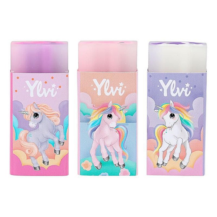 Cele 3 radiere Jelly de la Ylvi sunt transparente la exterior și au în interior un unicorn drăguț (violet/roz, alb/violet, roz/roz).
