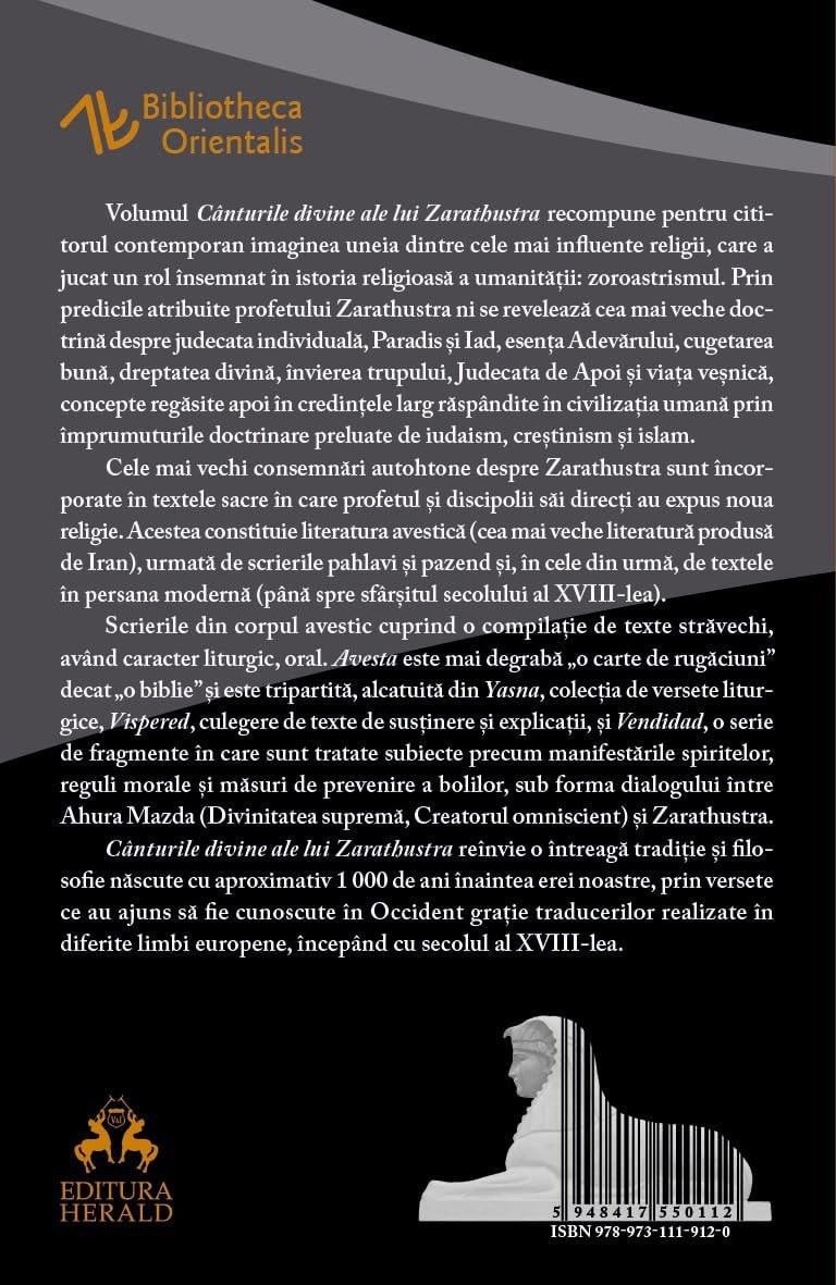 Canturile divine ale lui Zarathustra readuc la viață o întreagă tradiție spirituală și filosofică născută cu aproximativ o mie de ani înaintea erei noastre. Prin aceste versete, cunoscute în Occident datorită traducerilor realizate începând cu secolul al XVIII-lea, cititorul are acces la una dintre sursele fundamentale ale gândirii religioase universale. Volumul se adresează tuturor celor interesați de istoria religiilor, de filosofia spirituală și de rădăcinile comune ale marilor tradiții religioase ale lumii.