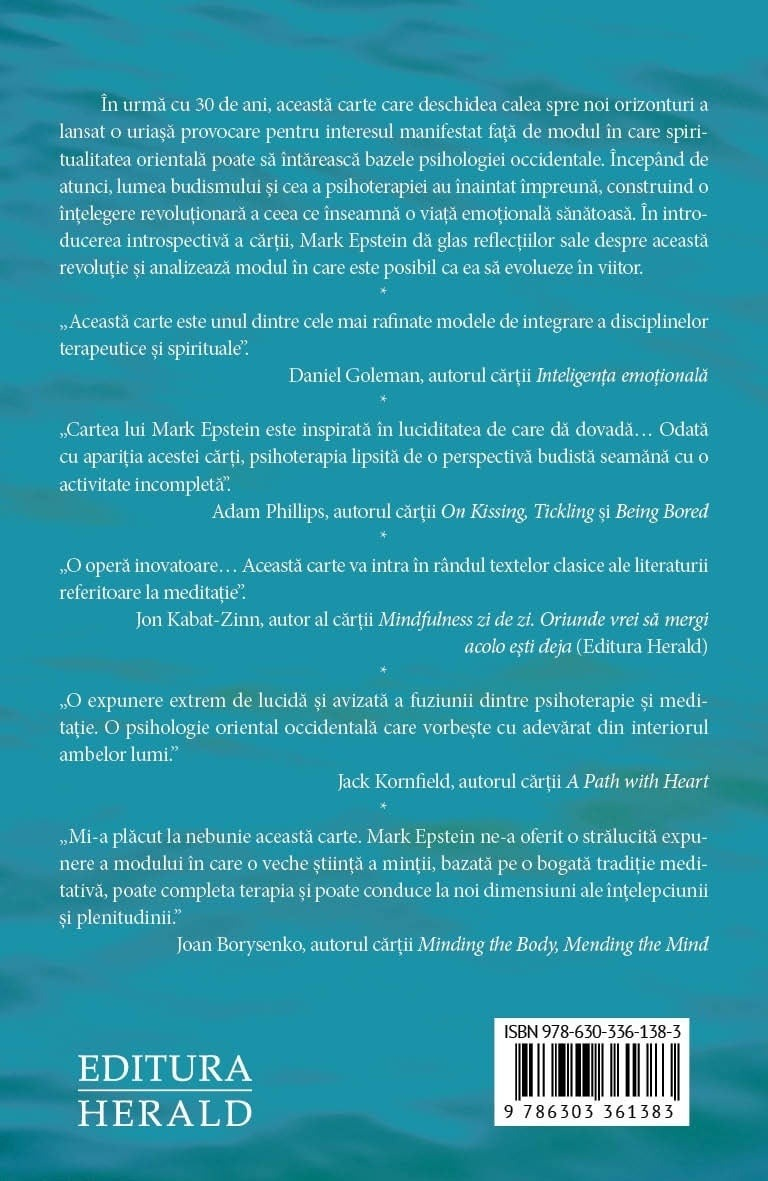 Această carte propune un dialog profund și accesibil între budism și psihoterapie, explorând natura minții și a suferinței dintr-o perspectivă integratoare. Mark Epstein arată cum practicile contemplative orientale pot completa și îmbogăți psihologia occidentală. Volumul deschide un spațiu autentic de reflecție pentru toți cei interesați de vindecarea emoțională și transformarea interioară.